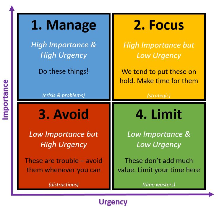 This concept of urgent not always equating to important is something I readily admit to still struggling with. I was raised to try and help whenever I could and so when someone comes to me with something that they feel is urgent, I tend to react in kind. But the reality is that doing so is not always the right choice.