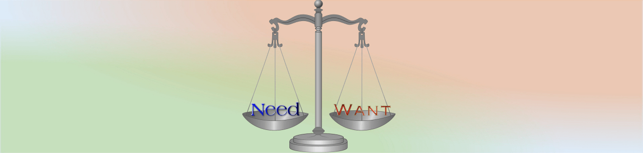 Which finally leads to the topic of this post – knowing a want from a need and being able to tell the difference. This may seem obvious but let’s start with a baseline. A need is something you must possess to accomplish your goal. If you need to live, you’ll have to have food, water, air and shelter. However, a want is something you desire that goes beyond crossing the finish line. You don’t need filet mignon, imported artisan water, clean and fresh alpine air and a 10 bedroom mansion to survive, but having them sure sounds better than eating old bread & stale water in a drafty tent set up next to the city dump.